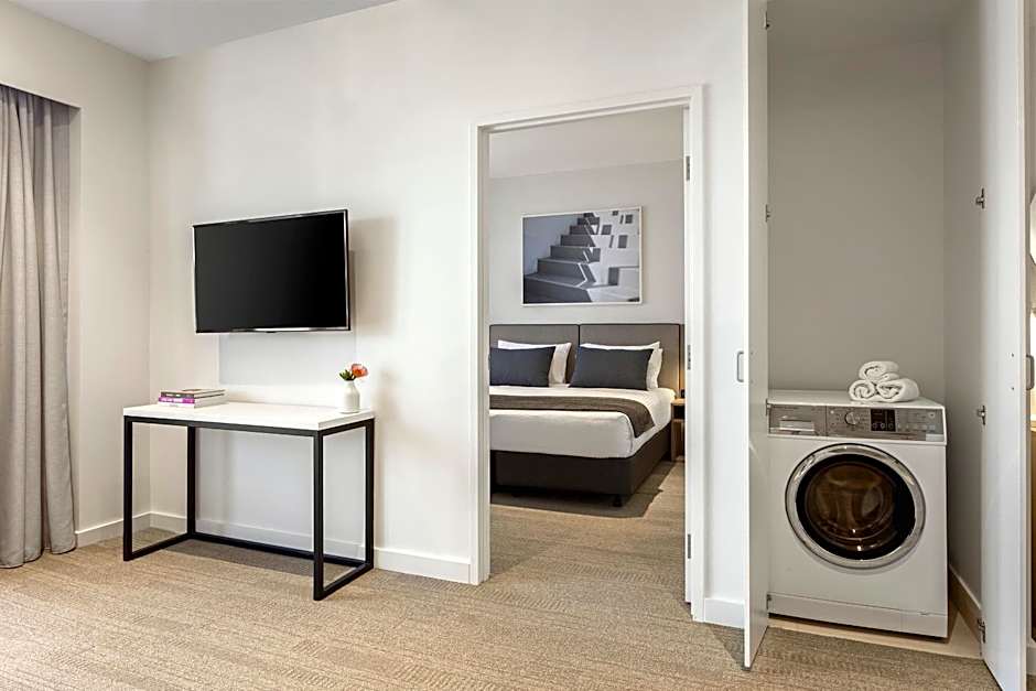 The Two-Bedroom Apartment provides space and privacy. Both bedrooms contain a king bed, which can also be configured as two single beds. A spacious central bathroom features laundry facilities to add to the convenience of your stay. There is also a fully equipped kitchen with an oven, cooktop, full-size fridge and dining table so meals can be prepared and enjoyed in the apartment. Guests can access the in-house fitness center and alfresco BBQ area.